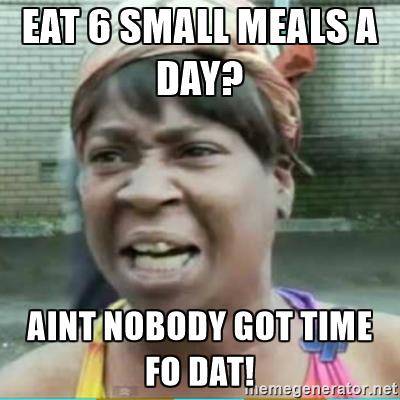 So that brings us to the next point. Total Energy Balance is what dictates weight management. In a Meta Analysis reviewing over 300 studies on the topic there were no significant differences found in fat loss between a variety of daily meals consumed. Basically, when calories are equated, more frequent feedings will not have enough of an impact to claim whether it is better or worse. Being able to adhere to a deficit is the most important factor in regards to weight loss, not the arbitrary number of meals eaten. For most, eating every 2-3 hours is simply not practical. The number of meals you eat should depend on your schedule, preference and IMO be somewhat structured around your training schedule to optimize performance and recovery (that is another article). In most cases eating between 3-5 meals daily will be ideal.